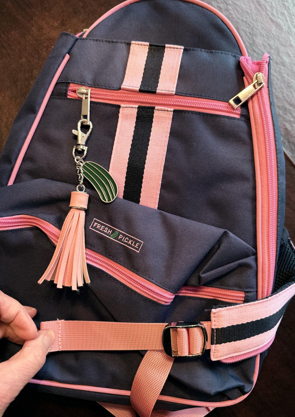 - Distinctive Fresh Pickle logo charm and lining